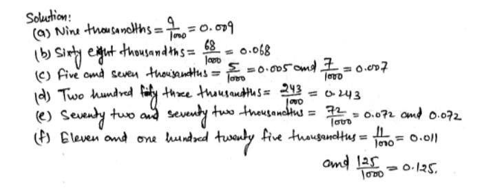 1 Write Decimal Numeral For Each Of The Following A Nine Thousandths B Sixty Eight Thousandths C Five And Seven Thousandths D Two Hundred Forty Three Thousandths E Seventy Two And Seventy Two Thousandths F Eleven And One Hundred Twenty Five